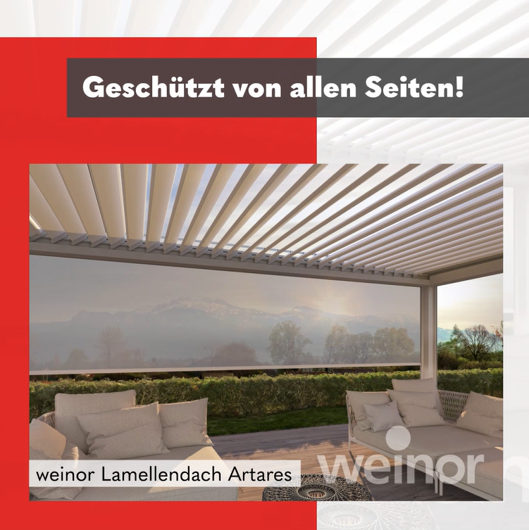 Mit einer Vertikal-Beschattung seid ihr unter eurem weinor Lamellendach von allen Seiten vor blendendem Sonnenlicht und unerwünschten Blicken geschützt – auch automatisch steuerbar für noch größeren Komfort!