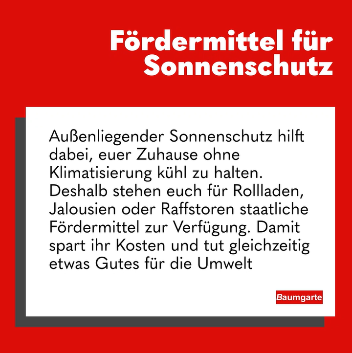 Sommerlicher Wärmeschutz hilft dabei, euer Zuhause ohne Klimatisierung kühl zu halten. Damit spart ihr Energie und leistet einen wichtigen Beitrag zum Klimaschutz. Deshalb stehen euch für außenliegenden Sonnenschutz, wie Rollladen, Jalousien oder Raffstoren, staatliche Fördermittel in Form von Krediten, Zuschüssen oder als Steuerbonus zur Verfügung. Eine wichtige Voraussetzung für die Förderung ist eine automatische Steuerung, die die Versorgung mit Tageslicht und den Sonnenschutz optimiert. Mit den Fördermitteln spart ihr einen großen Teil eurer Kosten und tut gleichzeitig etwas Gutes für unseren Planeten!