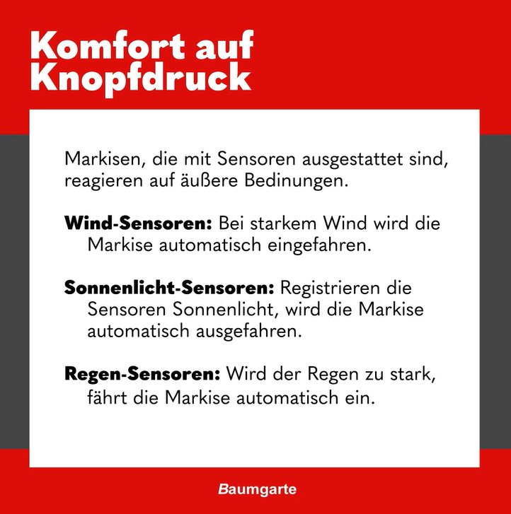 - Regen-Sensoren: Wird der Regen zu stark, wird die Markise ebenfalls automatisch eingefahren.