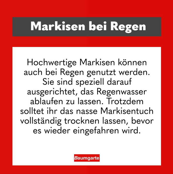 Hochwertige Markisen sind mit speziellen Funktionen ausgestattet, um Regen standzuhalten. Diese sorgen beispielsweise dafür, dass das Regenwasser abläuft und sich keine sogenannten Wassersäcke bilden können. Außerdem solltet ihr das Markisentuch unbedingt vollständig trocknen lassen, bevor es wieder eingefahren wird, um Schimmelbildungen zu vermeiden.