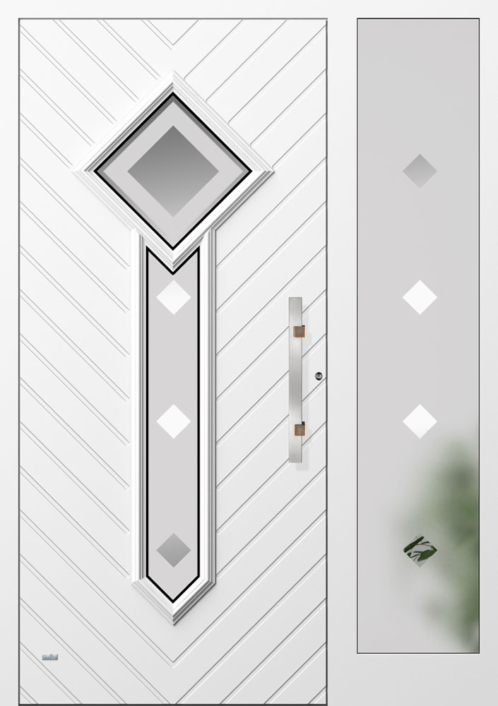 Applikationen in pflegeleichter Edelstahloptik sowie flächenbündig eingearbeitete Dekorelemente und Designverglasungen, deren Dekor sich in der Verglasung des Haustürseitenteils fortsetzt, sind einige der charakteristischen Merkmale dieser Serie.