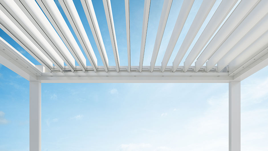 Die schlanke Pergola mit verfahrbaren Lamellen gibt die Sicht auf den Himmel frei. In einer einzigen Bewegung werden die Lamellen gedreht und kompakt zusammengefaltet. Genießen Sie die Weite: Seitliche, einrollbare Abdunklungen und Glaswände können ebenfalls installiert werden.