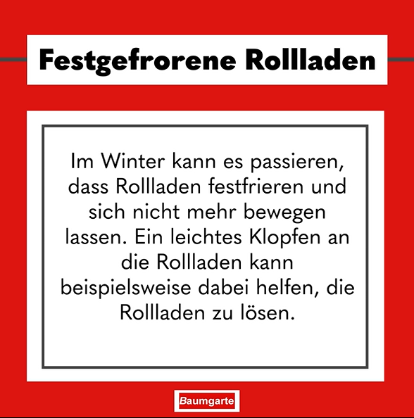 Um die Rollladen zu lösen, hilft meist ein leichtes Klopfen von außen mit der flachen Hand. Alternativ können die Fenster für kurze Zeit geöffnet werden, damit die warme Luft die festgefrorenen Rollladen löst. Gewalt sollte auf jeden Fall vermieden werden, damit die Rollladen nicht langfristig beschädigt werden.