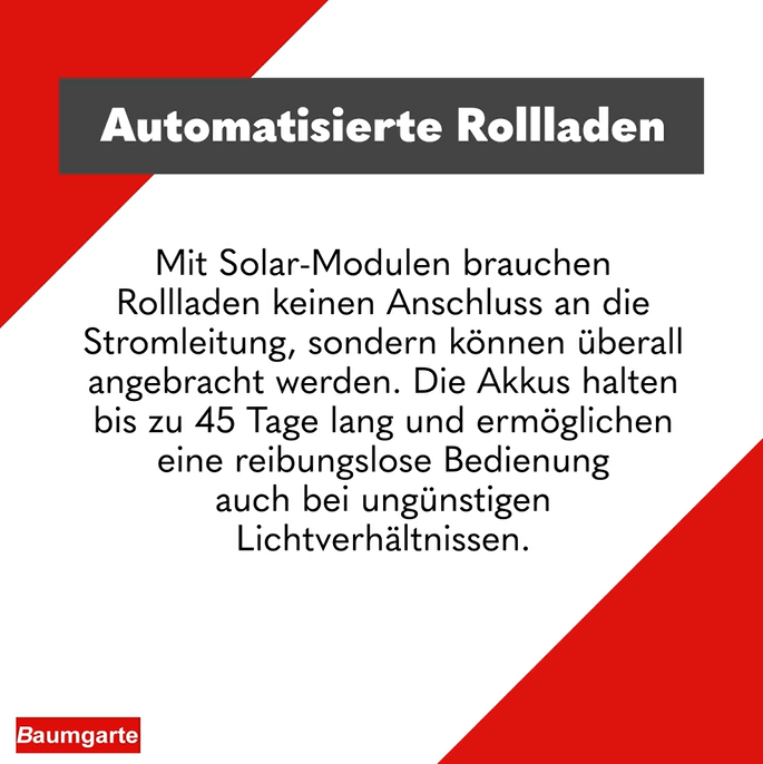 Automatisierte Rollladen können mithilfe von Solar-Modulen auch an Orten angebracht werden, an denen keine Stromleitung vorhanden ist. Tageslicht reicht aus, um die Akkus aufzuladen – und das sogar an der Nordseite eures Hauses! Die Akkus speichern bis zu 45 Tage lang Energie, sodass eine reibungslose Bedienung auch bei ungünstigen Lichtverhältnissen gewährleistet wird.
