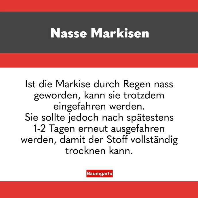 Während eines starken Unwetters sollte die Markise eingefahren werden, um sie vor Schädigungen durch Sturm und Regen zu schützen. Ist die Markise bereits durch Regenfall nass geworden, kann sie trotzdem eingefahren werden. Jedoch empfiehlt es sich, die Markise nach spätestens 1–2 Tagen erneut ausfahren, um den Stoff vollständig trocknen zu lassen und Stockflecken zu vermeiden.