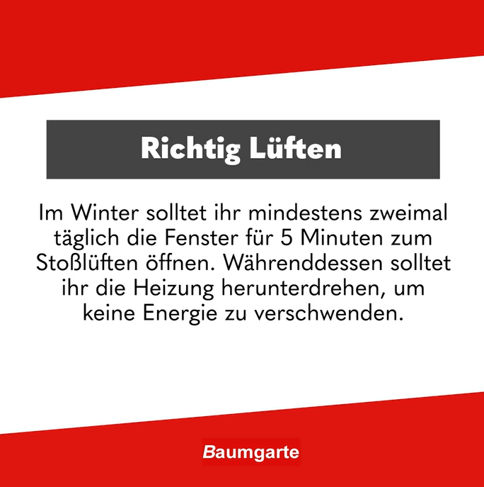 Ihr solltet dafür mindestens zweimal täglich die Fenster für 5 Minuten ganz öffnen und eure Innenräume stoßlüften. Währenddessen empfiehlt es sich, die Heizung herunterzudrehen. Damit sorgt ihr für ein gesundes Raumklima, vermeidet Schimmelbildung und verschwendet trotzdem keine Energie.💪