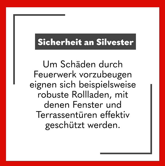 Beim ausgelassenen Feiern sollte man jedoch die Gefahren nicht außer Acht lassen! Um Schäden vorzubeugen, eignen sich beispielsweise robuste Rollladen, mit denen Fenster und Terrassentüren effektiv vor Feuerwerkskörpern und anderen Gefahren geschützt werden. Außerdem bieten hochwertige Rollladen einen verlässlichen Lärmschutz, was vor allem die tierischen Mitbewohner freut!