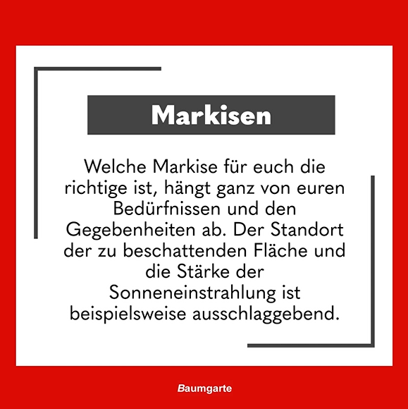 Das hängt ganz von euren Bedürfnissen und den Gegebenheiten ab. Wollt ihr eine besonders große Fläche mit der Markise beschatten, ist eine Pergolamarkise mit zusätzlichen Säulen die beste Wahl. Zeigt der Außenbereich nach Westen, hilft beispielsweise eine zusätzliche Vertikalbeschattung gegen die tief stehende Sonne am Nachmittag.