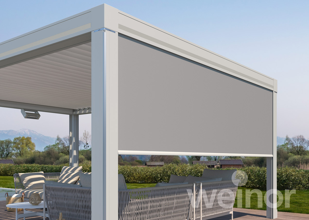 Unsere weinor Lamellendächer können an allen Seiten mit Senkrecht-Markisen ausgestattet werden. Bei Artares sind sie optisch attraktiv in die Rahmenkonstruktion integriert und verschwinden komplett in der Attika.