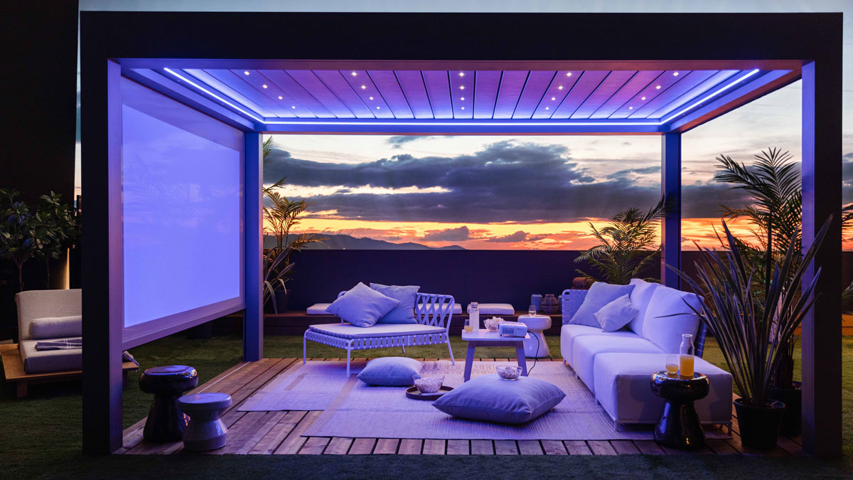 Dank der motorisierten Mechanismen und des Zubehörs kann die bioklimatische Pergola das ganze Jahr über und bei jedem Wetter zu einem perfekten Aufenthaltsort werden.